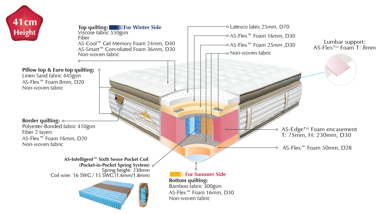 인견의 깔끔한 감촉, 아메리칸스타의 AS-Cool gel memory foam, Smart convoluted foam, 그리고 아주 특별한 벨기에 라텍스코사의 라텍스, 상하부 3중 신축성 폼의 조합을 육감적 2중 코일 스프링과 7.5cm 폼 박스 위에 결합한 최고급 소재에 최고의 기술력을 더해 우아한 외관으로 만들어 낸 최고급 매트리스입니다.