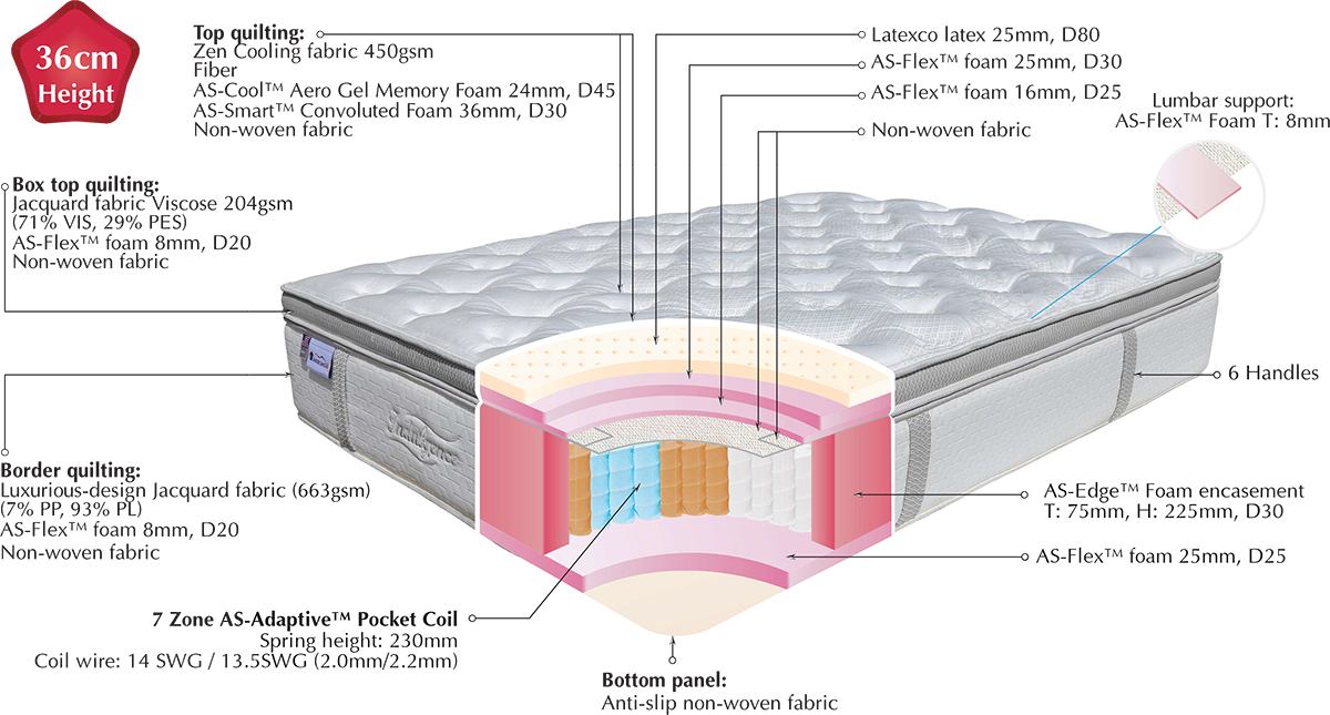 AS-Adaptive pocket coil 7-zone 시스템으로 완성시킨 최고의 기술력이 Luxury한 잠자리를 만들어 줄 것입니다.
